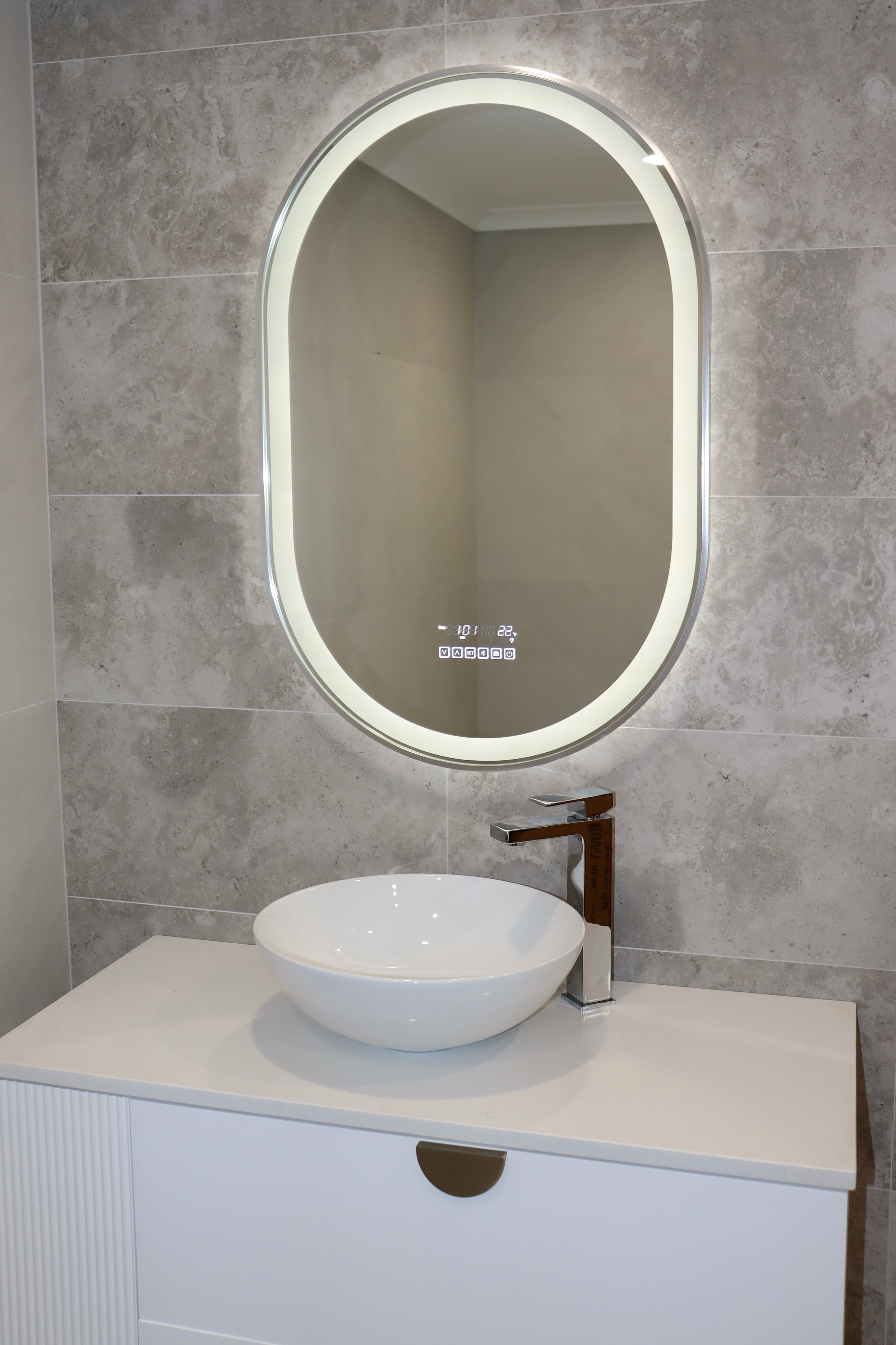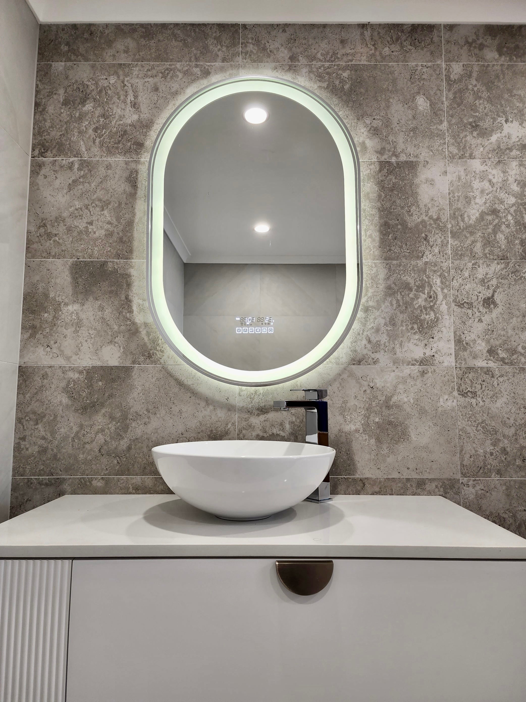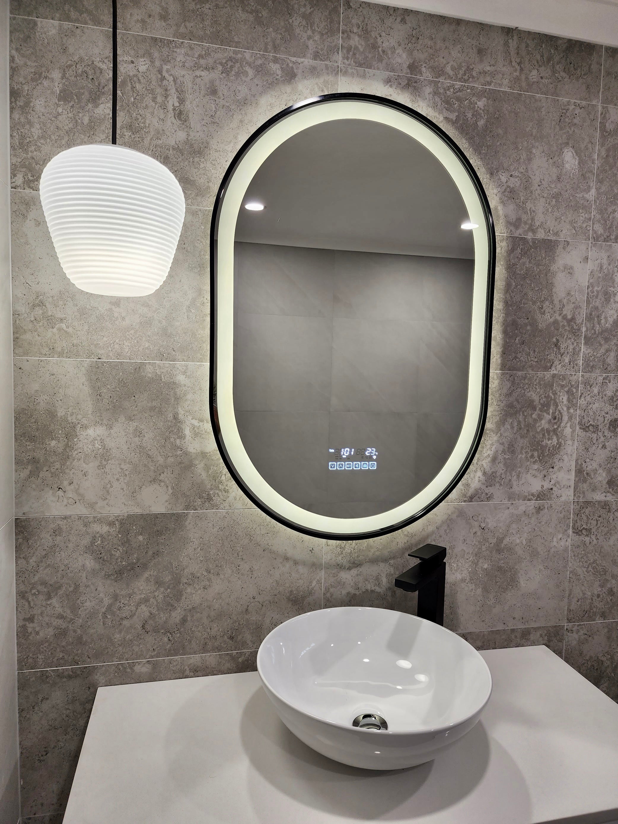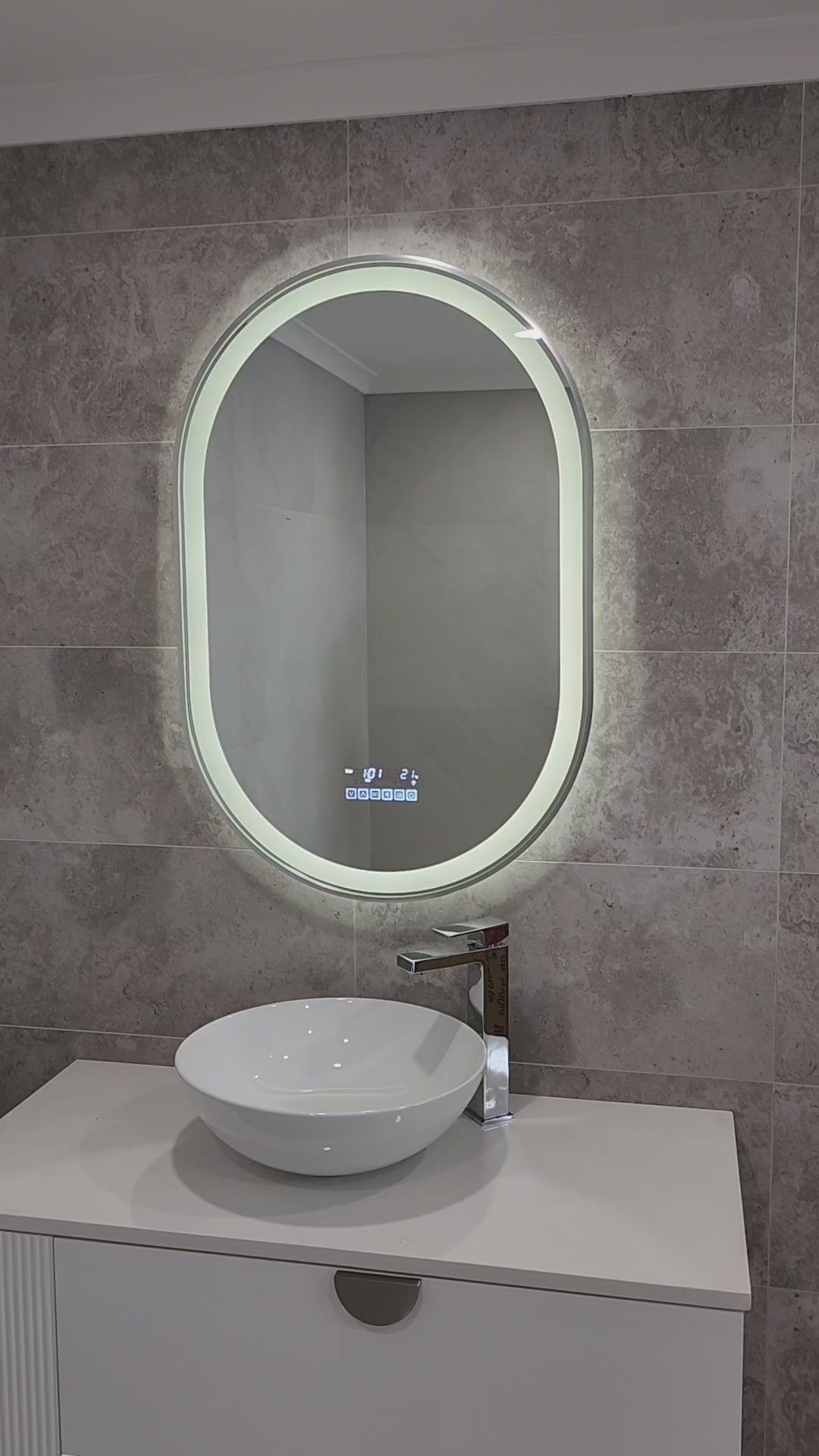 Its elegant oval silhouette adds softness and sophistication to modern interiors, while smart touch controls give you seamless access to lighting, audio, and visibility features — all in one beautifully designed mirror.