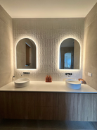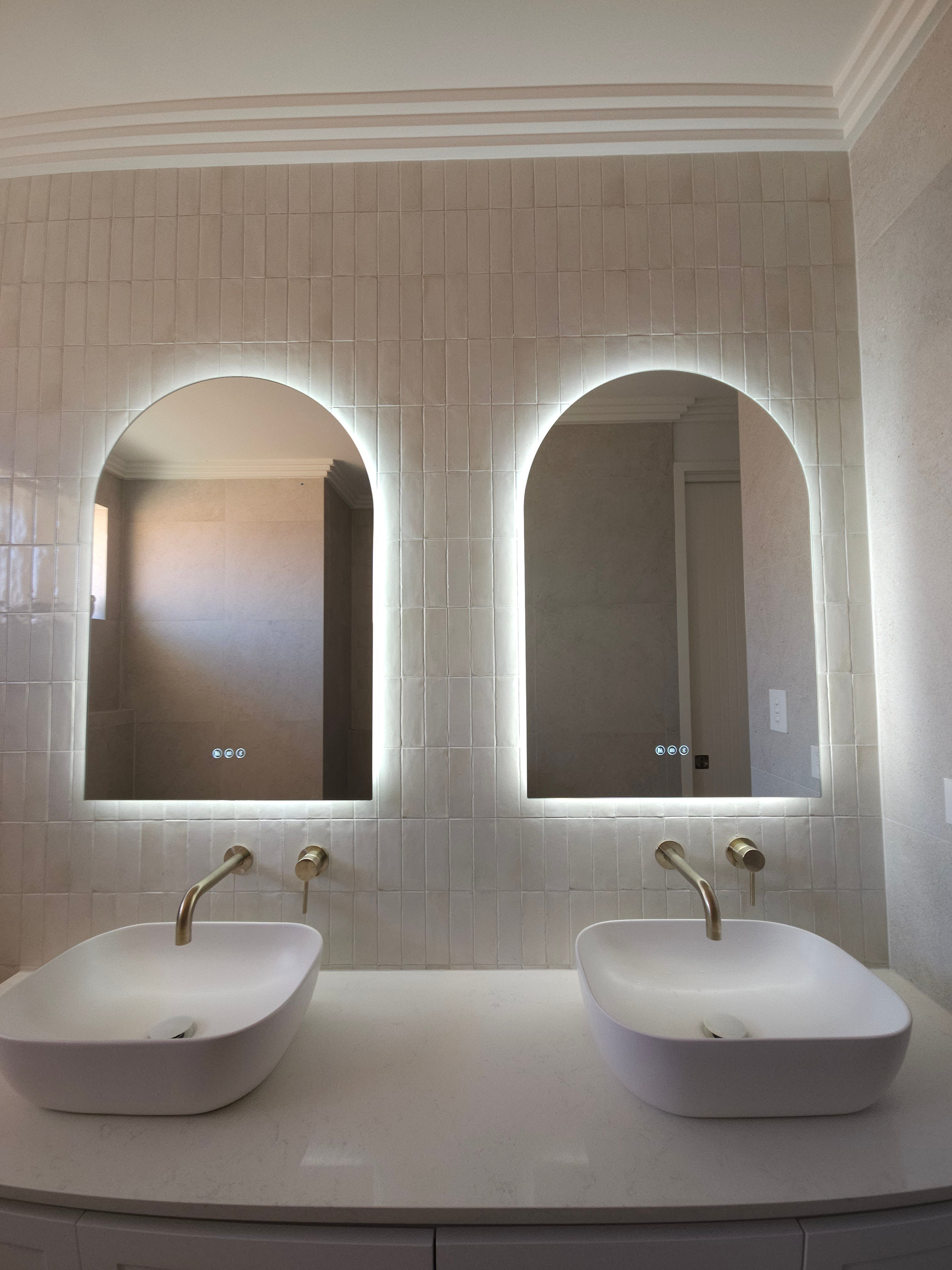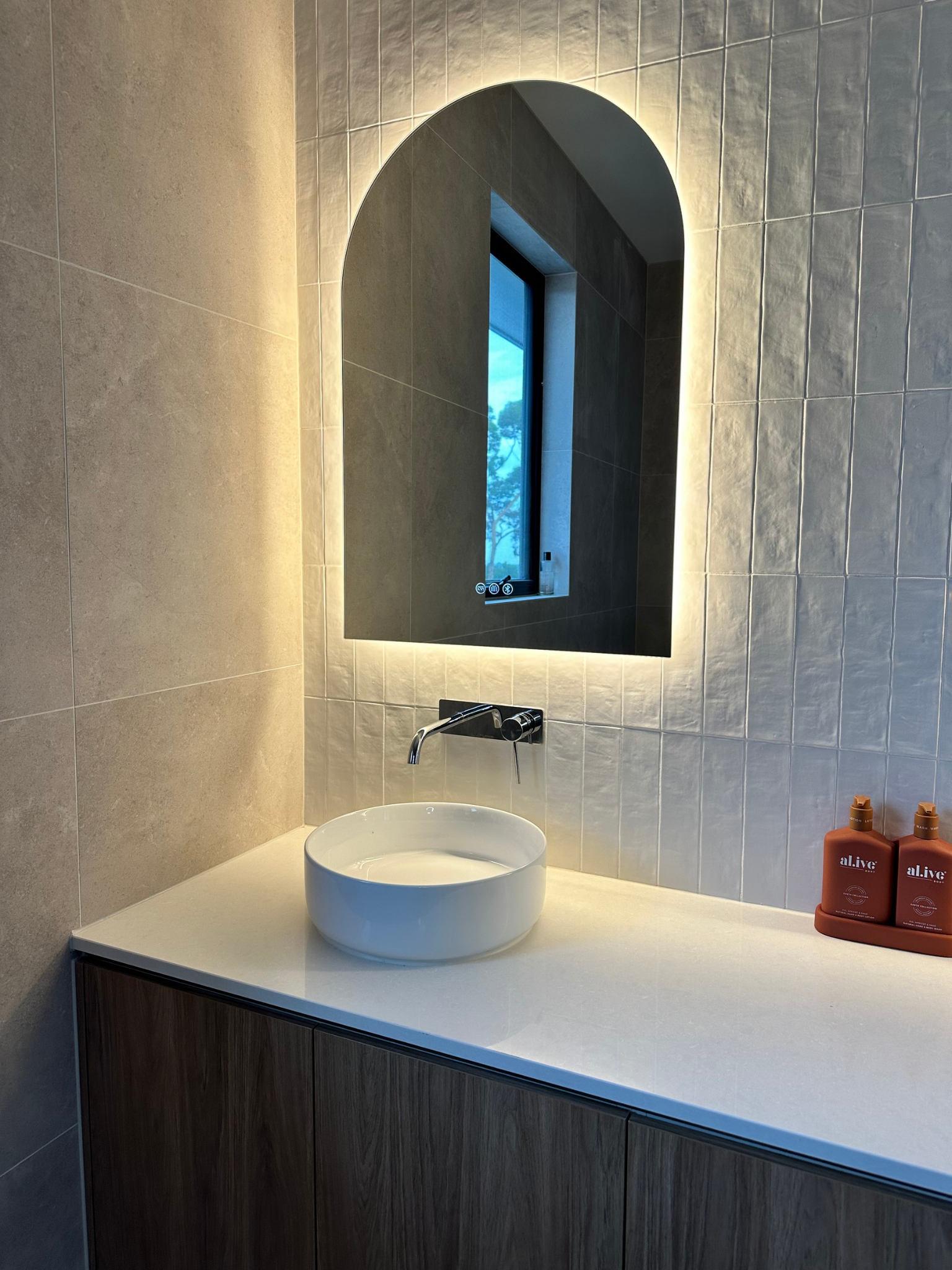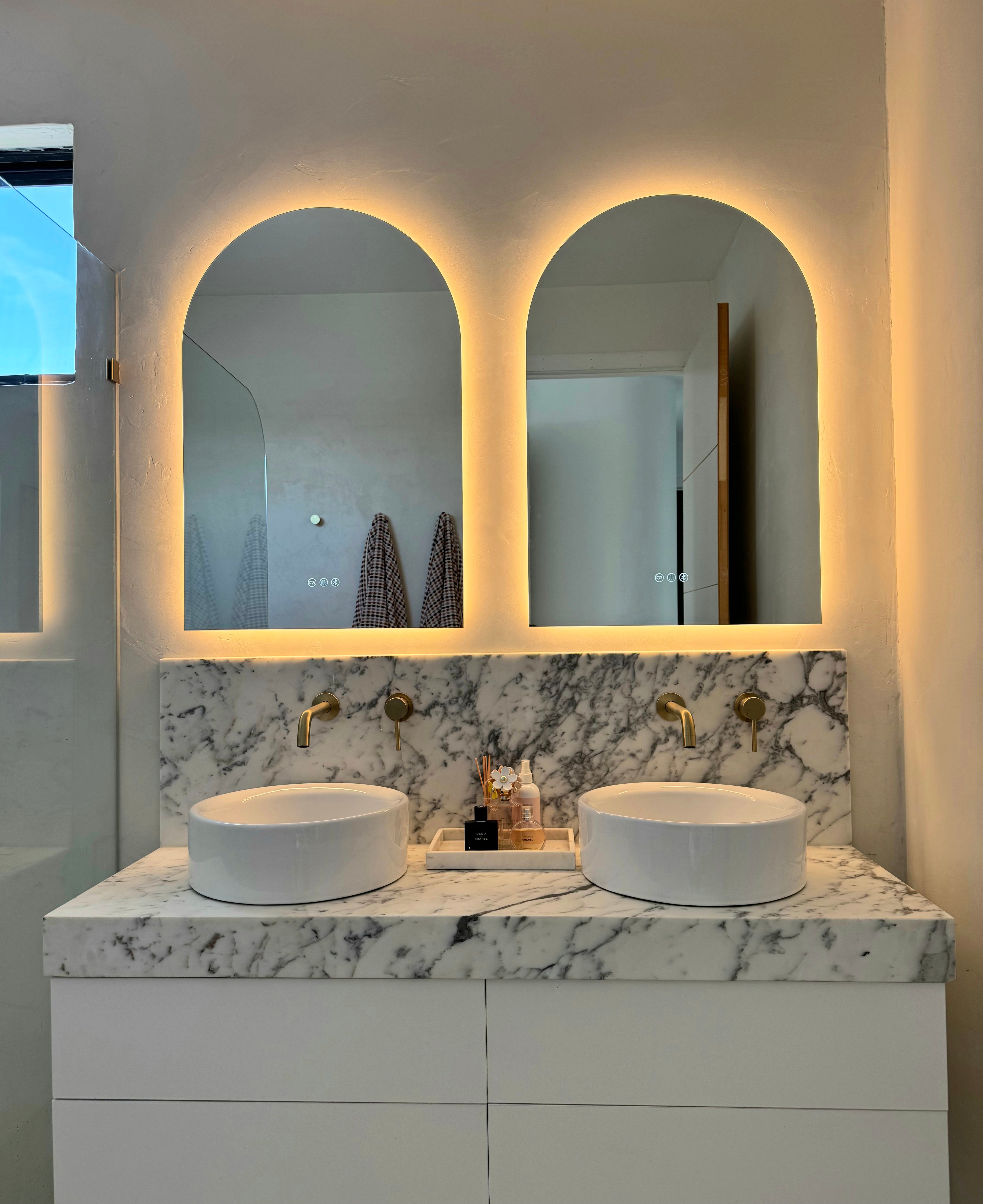 Make a powerful style statement with the Positano Lux Smart Mirror – where striking design meets advanced functionality. With its graceful arched silhouette, integrated Bluetooth audio, and colour-customisable lighting, this mirror transforms any room into a refined sanctuary of sound, light, and style.